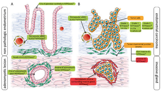 A graphical summary is shown in Figure 8, where the distribution and expression changes of NTPDase2 in non-pathological, adenomyotic, and tumor endometria are described. This summary clearly shows that stem cell markers, such as NTPDase2, can be expressed in other cell types.