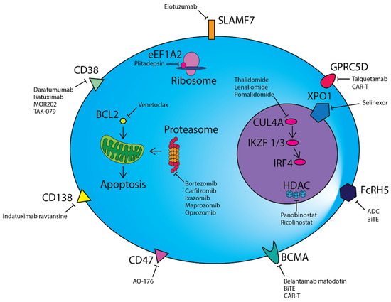 CD38, CD47, CD138, SLAMF7, GPRC5D, FcRH5 and BCMA are highly expressed on the surface of malignant plasma cells and are targeted by a range of different monoclonal antibodies or antibody–drug conjugates. Chimeric antigen receptor T-cell (CAR-T) and bispecific T-cell engager (BiTE) cellular therapies directed against BCMA, GPRC5D and FcRH5 are also a novel therapeutic avenue. Proteasome inhibitors prevent the degradation of misfolded proteins via the proteasome, resulting in eventual cell death due to the unfolded protein response. BCL2 inhibitors such as venetoclax induce mitochondrial outer membrane permeabilization, culminating in apoptosis. IMiDs alter the target specificity of Cereblon (CRBN) as part of an E3 ubiquitin ligase complex and lead to the degradation of Ikaros (IKZF1) and Aiolos (IKZF3), which consequently results in a reduction in IRF4, a key mediator of the oncogene MYC. Plitadepsin binds to eEF1A2 in the ribosome and abrogates its pro-oncogenic moonlighting effects. Additional therapies directed against targets within the nucleus include the nuclear transport protein XPO-1 and epigenetic regulators such as histone deacetylases (HDACs).