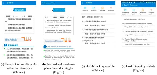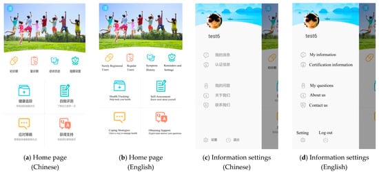 Based on all our previous work, the final app structure and functions in the mobile terminal include eight modules. Users see the home page as Figure 3a after opening the SM app (Figure 2). Four major modules are shown on the home page, including health tracking, self-assessment, coping strategies, and obtaining support. Other modules with smaller logos are newly registered user, regular user, symptom history, and reminders and settings. By clicking the round blue button at the top left of the home page, users can connect their personal information with the HIS of SPHC through the Certification Information button (Figure 3c). Technicians check users’ ID numbers and names within 48 h and give user’s permission to browse their medical reports in the web-based administration portal. If users have had visits in SPHC, they can see all the information, including their prescriptions and laboratory reports, in the SM app.
