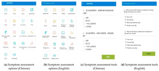 By clicking the self-assessment module on the home page, users can see symptom assessment options as in Figure 4a. Symptom assessment includes two mental symptoms (depression and anxiety) and 16 physical symptoms (fatigue, headache, muscle and joint pain, fever, sleep disorder, diarrhea, nausea or vomiting, shortness of breath or cough, numbness/tingling of hands or feet, perianal neoplasms, fat redistribution, weight loss, rash, oral leukoplakia or ulcers, memory loss, and blurred vision). By clicking on one of the symptom buttons (such as depression), users can see the assessment tools as in Figure 4c. We applied PHQ-2 to screen depression [27] and the Generalized Anxiety Disorder scale (GAD-2) to screen anxiety [28]. Both PHQ-2 and GAD-2 are widely used valid screening tools. There were no available validated and widely-used screening tools for each physical symptom. Therefore, we designed screening tools for 16 physical symptoms. According to the symptom management framework, symptom experience focuses on symptom occurrence (the cognitive pathway) and symptom distress (the emotional pathway), i.e., symptom severity and symptom distress. Therefore, all the physical symptoms were assessed from these two aspects. For example, the two items for fatigue: (1) If a score of 0 means no fatigue at all, and a score of 10 means the worst fatigue you can imagine, how much do you rate your fatigue over the past 2 weeks? (2) How much does fatigue affect your daily life (0 = not at all, 1 = a little, 2 = a moderate amount, 3 = very much, 4 = extremely)? All the brief self-reported tools that assess each symptom are available in Supplementary Material Table S3.