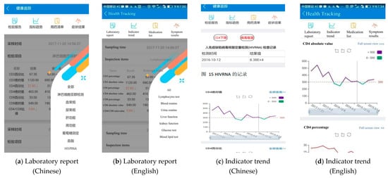 By clicking the health tracking module on the home page, users can see their latest prescription and four submodules on the screen, i.e., laboratory report, indicator trend, medication list, and symptoms results (Figure 5c). By clicking the laboratory report button, users can see their lab report results transferred from the HIS system (Figure 6a). If they have not visited SHPC before, they can input blood test results themselves. The indicator trend button in the health tracking module can generate tables and trend charts to help users track their health indicators, including their viral load, CD4+ T cell count, body temperature, body weight, pain, fatigue, and ART medication adherence (Figure 6c).
