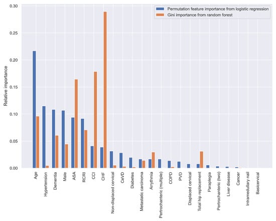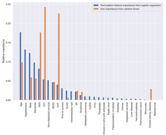 When using the statistically significant variables selected by the stepwise LR analysis in Table 3, the top five variables with the greatest predictive ability are age, hypertension, dementia, sex, and ASA classification according to the PI method, and CHF, CCI, ASA, age, and RCRI according to the GI method (Figure 4).