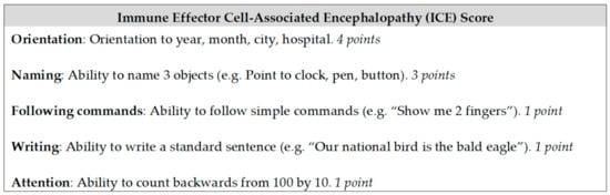 Similar to CRS, a number of different ICANS grading systems have been developed [,]. The ASTCT consensus group formed an Immune Effector Cell-Associated Encephalopathy (ICE) screening tool to score the degree of encephalopathy out of 10 (Figure 1). The ICE score is used together with other features of ICANS in the consensus grading system (Table 3) [].