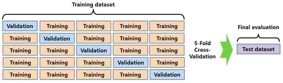 Of the total patients, data of 150 patients were classified as the test set and excluded from training. The data of the remaining 810 patients were split into five groups and 5-fold cross-validation was performed (Figure 1) [23]. At each step, a model was constructed and its performance was evaluated by calculating its success rate for identifying the need for surgery in the training, validation, test, and total sets.