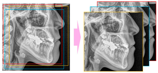 The landmarks of the patients’ cephalometric radiographs were automatically detected with a software program using a gradient boosting algorithm (WebCeph, AssembleCircle, Seoul, Korea). WebCeph has been used for landmark detection in several studies [24,25]. The minimum box, including all the landmarks, was selected with an external margin of 5% and the lower part of the box was selected by square cropping. The image was resized to 256 × 256 pixels.