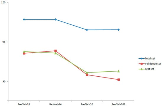 The results of this study showed that the average success rate for diagnosis of orthognathic surgery for the ResNet-18 model was 99.86% in the training dataset, 93.58% in the validation dataset, and 93.80% for the test dataset; it had a total predictive ability of 97.85% for the total dataset. The Resnet-34 model had an accuracy of 99.81%, 93.89%, and 93.60% in the training, validation, and test datasets, respectively, and a total predictive ability of 97.84% for the total dataset. The Resnet-50 model’s accuracy was 99.21% in the training dataset, 90.86% in the validation dataset, and 91.13% for the test dataset; it had a total predictive ability of 96.54% for the total dataset. The Resnet-101 model’s accuracy was 99.34%, 90.25%, and 91.33% in the training, validation, and test datasets, respectively, with a total predictive ability of 96.55% for the total dataset (Figure 4). The models of ResNet-18 and 34 showed higher prediction performance than the ResNet-50 or 101 models. We rejected the null hypothesis that there is no difference in predictive ability depending on the depth of the neural network.