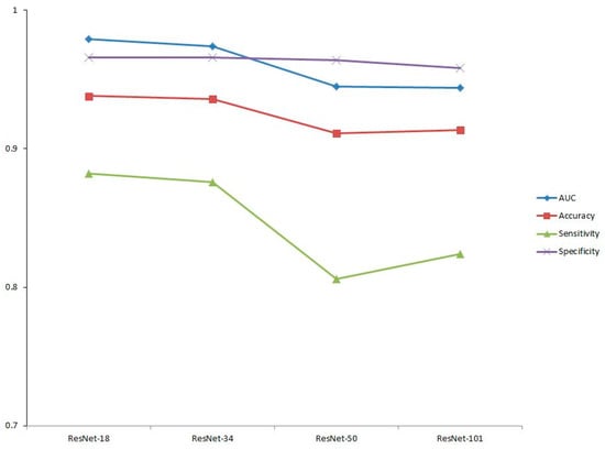 Figure 5 shows the ROC curves. The ROC curve is a graph showing the performance of the model through the relationship between the true positive rate and the false positive rate at all classification thresholds. AUC refers to the area under the ROC curve. AUC values range from zero to one. A model with 100% incorrect prediction has an AUC of 0.0 and a model with 100% accurate prediction has an AUC of 1.0. The AUC is not an absolute value, but rather a measure of how well the prediction is evaluated. The AUC measures the predictive quality of a model regardless of which classification threshold is selected. In screening performance, based on the AUCs evaluated for sensitivity and specificity, ResNet-18 had the best performance at 0.979, followed by ResNet-34 at 0.974, ResNet-50 at 0.945, and ResNet-101 at 0.944 (Table 2). Figure 6 shows the screening performance of the four models used in this study. When determining the overall performance, the difference in specificity was not large, but there was a difference in sensitivity that led to the difference in accuracy.