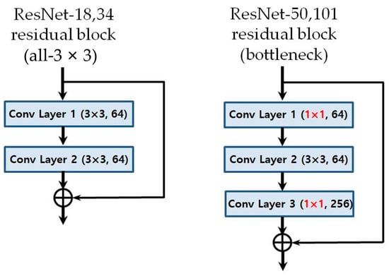 In addition, in the case of ResNet-50 and 101 models, which have deeper neural networks than those of ResNet-18 and 34 models, the biggest difference is that the residual block has a bottleneck structure [26]. Unlike the ResNet-18 and 34 models that pass through the 3 × 3 filter twice, ResNet-50 and 101 models are called bottleneck structures because they sequentially pass through a 1 × 1 convolution filter, a 3 × 3 filter, and again through a 1 × 1 filter (Figure 7). This structure is adopted because as the network deepens, the number of weights increases tremendously and the burden of computation increases. By adopting a bottleneck structure, the speed of calculation increases by reducing the amount of computation required without causing a loss of key information. The deeper model showed better performance in the ImageNet classification than the existing ResNet-18 and 34 models and ResNet-50 is one of the most popular state-of-the-art models [31].