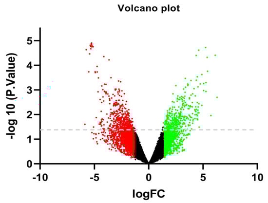Volcano plot of the DEGs from the GSE148747 dataset. X-axis: logFC, large-scale fold changes; y-axis: -log10 of the p-value is showing the statistical significance. The green points represent the up-regulated genes while red points are for the down-regulated genes.