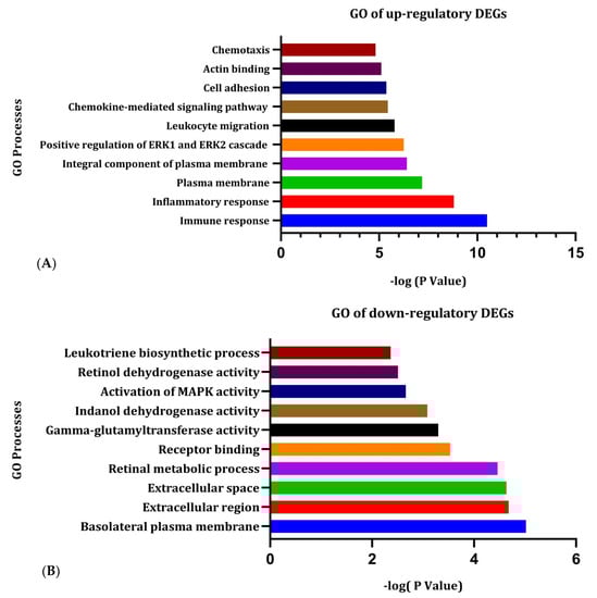 Functional analyses of the differentially expressed genes (DEGs) in cervical cancer. In figure (A), GO of up-regulatory DEGs and in (B). GO of down-regulatory DEGs. Each of the GO processes was plotted based on the -log (p) value.