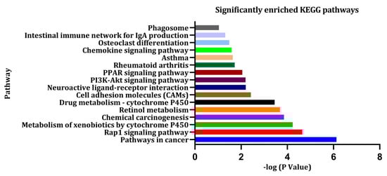 The initial ontology of gene (GO) and KEGG pathway enrichment analyses of the DEGs were annotated (p < 0.05) using the online bioinformatics tool DAVID v6.8 [38]. The human genome was selected as the background parameter, and Affymetrix based identification was selected as identifier. The KEGG pathway enrichment analyses of the DEGs were cross-checked using the NetworkAnalyst online tool [39]. Gene Ontology (GO) study is a frequently used approach for the functional studies of large-scale transcription or genomic data [40,41]. Similarly, the Kyoto encyclopedia of genes and genomes (KEGG) is generally used to understand metabolic pathways for gene annotation [42,43].
