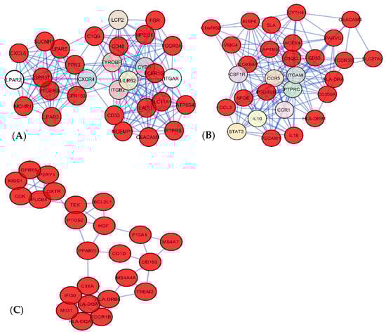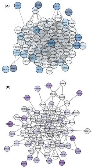 The online database STRING (v11.0, http://www.string-db.org/ accessed on 17 April 2020) was used to construct the PPI network of the proteins encoded by DEGs. The String is an online repository with 24,584,628 proteins from 5090 organisms to predict the relationship between genes [44]. The combined score was set at less than 0.75 (medium confidence score) to be considered significant.