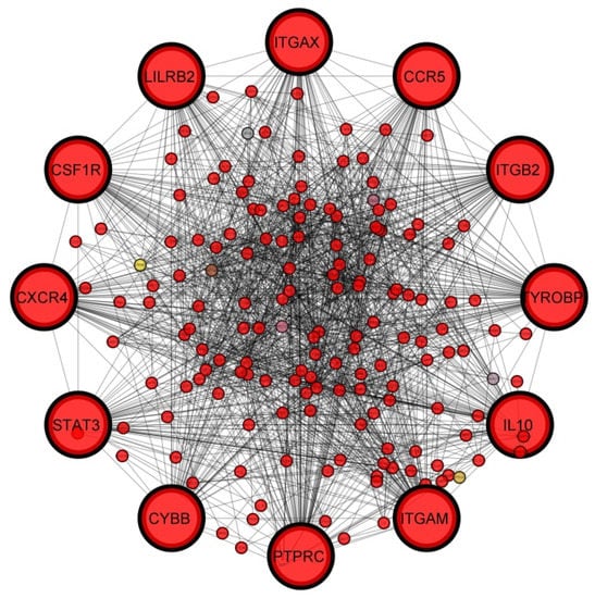 PPI network with identifying hub genes. The highlighted 12 nodes represent the hub genes. The degree score method of cytoHubba considers 94 nodes in this network from the merged PPI network.
