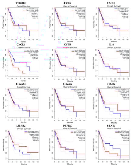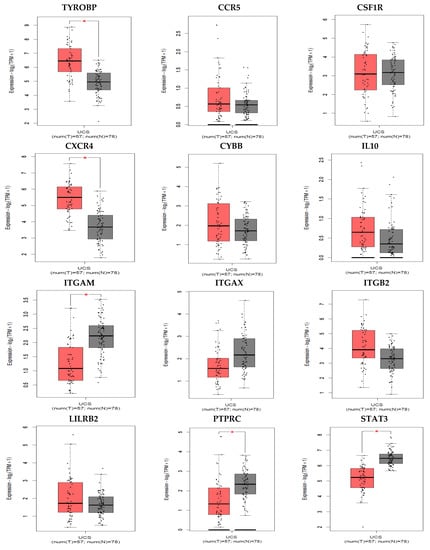 The CXCR4 down-regulation and silencing impairs cell adhesion, preventing metastasis. MMP-9 levels are substantially lower in CXCR4-deficient cells, and CXCR4 down-regulation reduces tumor development in vivo [56]. The epigenetically silenced CXCR4 gene prevents cells from responding to the paracrine source of SDF-1, resulting in cell adhesion failure, which is one of the primary events in cervical carcinogenesis metastasis and development [57,58]. CXCR4 receptor silencing by RNA interference, on the other hand, resulted in a reduction in the cells’ ability to signal, cause migration, and form holoclone-like colonies while having little effect on their viability or multiplication [56]. Smith et al. have reported that the initiation of cell proliferation and/or survival of cervical cancer cells is not possible without the CXCR4 receptor [59]. From the Kaplan–Meier overall survival analysis, the level of only CXCR4 expression was significantly related to the overall survival of patients with cervical cancer, while the rest of the hub genes’ survivability was lower in the high expression group (Figure 8). According to our analysis from DEGs, among the identified key 12 hub genes, only STAT3 showed the down-regulatory expression patterns whilst all the remaining genes were up-regulated. For the validation of this analysis, the GEPIA expression level of the hub genes were also employed and gene- ITGAM, ITGAX, PTPRC along with STAT3 were found in lower expression levels in tumor cells (Figure 9).