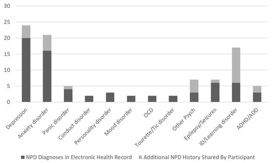 Neurodevelopmental/psychiatric diagnoses there were documented in participants’ electronic health record (EHR) versus participant reported diagnoses that were absent from the EHR. NPD—neurodevelopmental/psychiatric disorder; OCD—obsessive compulsive disorder; ID—intellectual disability; ADHD—attention deficit hyperactivity disorder; ADD—attention deficit disorder.