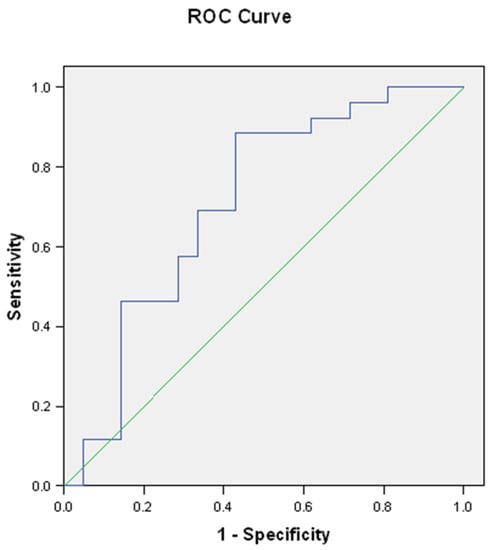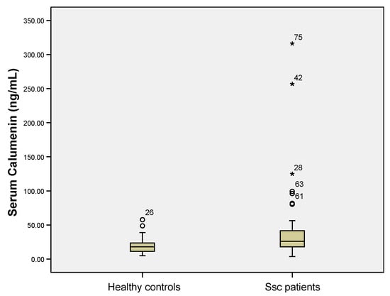 Serum calumenin levels were higher in Ssc patients compared to controls (median 26.14 ng/mL (interquartile range—IQR 27.22) versus median 17.97 ng/mL (13.82), Mann Whitney U test, p = 0.002, Figure 1). Ssc patients with a modified Rodnan score ≥ 14 (thus with diffuse cutaneous fibrosis) had higher circulatory calumenin levels. Median calumenin levels in Ssc patients with diffuse cutaneous fibrosis were 30.55 ng/mL (30.12) versus 20.08 ng/mL (16.57), Mann Whitney U test, p = 0.015