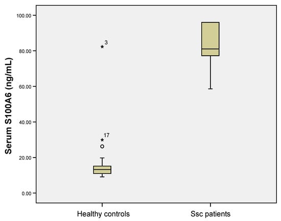 Serum S100A6 levels were statistically significant higher in the Ssc group compared to controls (median 81.06 ng/mL (18.80) versus median 13.24 ng/mL (4.85), Mann Whitney U test, p < 0.001, Figure 3).