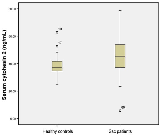 Serum cytohesin 2 levels were statistically significant higher in Ssc patients compared to controls (median 45.02 ng/mL (17.07) versus median 37.02 ng/mL (7.15), Mann Whitney U test, p = 0.003, Figure 4).