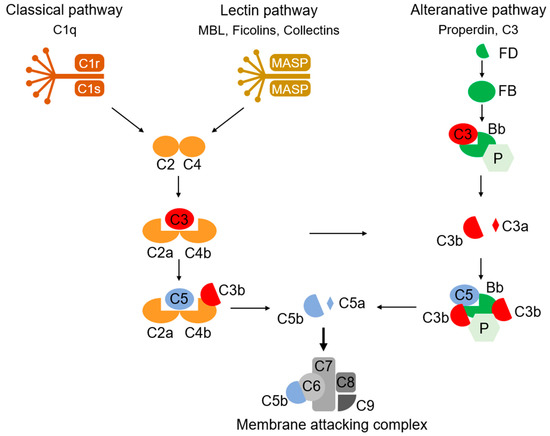 An overview of systemic complement activation. The complement system is composed of nine main components (C1–C9) and regulatory factors. Immunological functions are conducted by three pathways: the classical, alternative, and lectin pathways. In these pathways, enzymatic chain reactions of the complements proceed to finally form a membrane attack complex to destroy bacteria and virus-infected cells. MASP, mannose-binding protein-associated serine protease; FD, factor D; FB, factor B; Bb, factor Bb; P, properdin.
