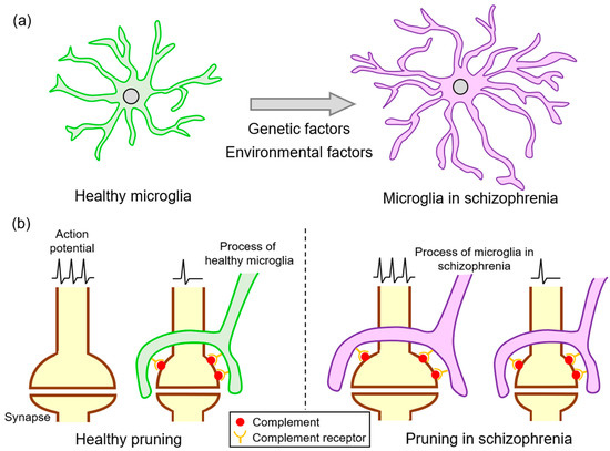The microglial synaptic pruning in schizophrenia. (a) Microglia exhibit hyper-ramified morphology in schizophrenia due to genetic and environmental factors. (b) Healthy microglia eliminate complement-tagged synapses with lower activity. In schizophrenia, hyper-ramified microglia prune healthy synapses by the excessive activation of complements.