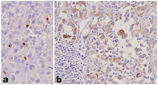 Osteopontin expression in adrenocortical carcinoma. The pattern of staining in adrenocortical carcinoma tumor cells is cytoplasmic, either with a peculiar dot-like paranuclear appearance (a) or diffuse within the cytoplasm (b). The intratumoral lymphocytes (b, bottom left) are un-reactive (original magnification 400×).