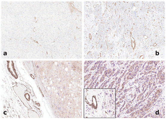 - Bernini, G.P.; Moretti, A.; Bonadio, A.G.; Menicagli, M.; Viacava, P.; Naccarato, A.G.; Iacconi, P.; Miccoli, P.; Salvetti, A. Angiogenesis in human normal and pathologic adrenal cortex. J. Clin. Endocrinol. Metab. 2002, 87, 4961–4965. [Google Scholar] [CrossRef]