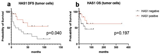 Disease free (DFS) and overall (OS) survival analyses did not show any significant difference in whether patients were positive or negative for osteopontin or laminin α3. Laminin α3 scores 0–1 had a median DFS and OS of 62 months and “undefined”, respectively, as compared to median DFS and OS of 30 and 61 months, respectively, in cases with 2–3 scores (all p values not significant). Osteopontin expression was also not associated with survival, with median DFS of 37 and 22 months and median OS “undefined” and of 61 months, in negative and positive cases, respectively (all p values not significant). HAS-1 density of expression in the vascular network was not associated to a specific survival, with median DFS of 22 and 49 months and median OS both “undefined”, in cases with score 0–2 and with score 3, respectively (all p values not significant). Interestingly, negative HAS-1 expression was associated with shorter survival (Figure 3). In fact, a trend towards significance was observed for OS, with a 49-month median survival in negative cases as compared to “undefined” in positive cases (Log rank test p value 0.197, HR 2.15). Moreover, DFS was significantly different in HAS-1 negative and positive cases, with a median survival of 17 and “undefined”, respectively (Log rank test p value 0.040, HR 2.77).