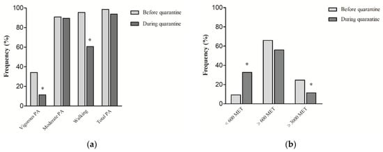 (a) Proportion of total and domain-specific physical activity of women before and during COVID-19 home confinement; (b) Proportion of low active (MET < 600), moderate active (MET ≥ 600), and high active (MET ≥ 3000) women before and during COVID-19 home confinement. * Before vs. during quarantine, χ2 test, p < 0.05; Notes: IPAQ score is expressed as MET-min/week; PA = Physical Activity.
