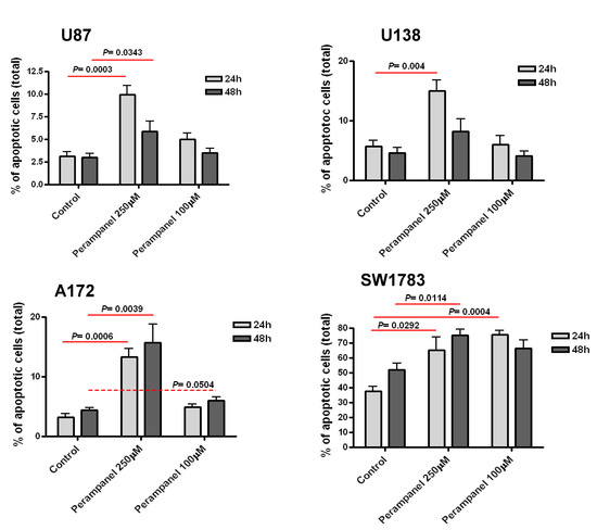 The cellular sensitivity of the human glioma cell lines U87, U138, A172, and SW1783 to perampanel was examined following different times of exposure (1 h and 24 h). A dose-dependent effect of perampanel was observed in all the tested glioma cell lines (Figure 1). The most marked anti-proliferative effect was detected when cells were exposed to perampanel for 24 h with small differences in IC50 values among the various cell lines (range: 178.5–258.5 µM). To determine whether the treatment resulted in an induction of apoptotic cell death, we performed a flow-cytometric analysis of apoptotic cells by PI/Annessin V assays. The results are summarized in Figure 2. Apoptosis was determined 24 h and 48 h after drug exposure start, i.e., after continuous 24 h exposure and 24 h after incubation in drug-free medium following the 24 h exposure. In all cell lines, the treatment with 250 µM perampanel produced a marked increase of apoptosis, with respect to the untreated cells. This increase was statistically significant in all cell lines when measured after 24 h of drug exposure; in A172 and SW1783, a statistically significant increase of apoptosis was detected even after 48 h or using a lower perampanel concentration, i.e., 100 µM (Figure 2).Low levels of necrosis were found in all cell lines (Supplementary Figure S1), and, although perampanel could induce some necrosis, this effect was quantitatively marginal (always below 2%).