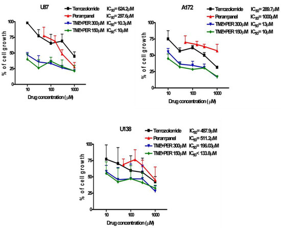 Since temozolomide (an alkylating agent able to cross the blood-brain barrier) is widely used in the clinical treatment of GBM, we examined whether perampanel displayed a favorable interaction with temozolomide, using cell growth inhibition assays. U87, U138, and A172 cells were pre-treated for 1 h with perampanel and then exposed to increasing concentrations of temozolomide for an additional 72 h (Figure 4). Sensitivity to TMZ alone was in the high micromolar range, the A172 cell line being the most sensitive.