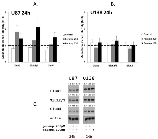 Since AMPA receptors are heterotetrameric proteins consisting of tetramers of four different subunits (GluR1–4) [15], putative modulations in the expression of GluR1, GluR2/3, and GluR4 subunit were evaluated in U87 and U138 after cell exposure to perampanel. Treatment of U87 cells with perampanel resulted in an overall increased expression of all GluR subunits at both perampanel concentrations, as compared to control cells. The increase was particularly evident for GluR1 at 250 µM and GluR2/3 at 150 µM, as detected by flow cytometry after 24 h (Figure 5, panel a). Although with some discrepancies compared to flow cytometry, western blot analysis confirmed the trend toward increased GluR subunits expression, more evident for GluR1, after exposure of U87 to perampanel 150 µM (Figure 5, panel c, right).
