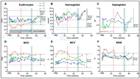 We observed a reversible decrease of RBC level and hematocrit, but no manifest anemia in all three patients in the first weeks after treatment initiation (Figure 1A,B). No major change in haptoglobin, a marker of hemolysis, was detected during dasatinib administration (Figure 1C); the mean corpuscular volume (MCV), mean corpuscular hemoglobin (MCH), and red blood cell distribution width (RDW) increased slightly under medication, especially in P3 (Figure 1D–F). In the first week of treatment, we observed a transient thrombocytopenia (minimum 107 GPt/L in P1). No relevant neutropenia <1.5 GPt/L nor thrombopenia <100 GPt/L occurred. After discontinuation of dasatinib, there was a drop in hemoglobin and haptoglobin, suggesting a transient hemolytic episode in P1 and P2 (Figure 1B,C). Taken together, these recorded mild symptoms and laboratory abnormalities are known adverse reactions/events of dasatinib, which did not require us to discontinue the treatment [47]. Dasatinib was withdrawn after 50.4 (P1) and 48.7 (P2) weeks for re-evaluation purposes as predetermined with the health insurance.