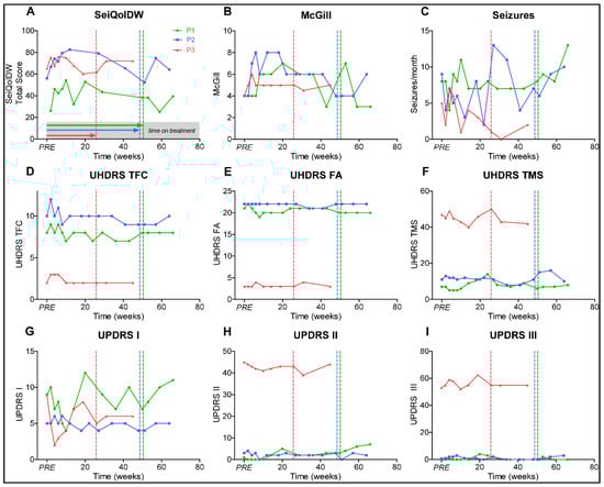 Graphs represent (A) Schedule for the Evaluation of Individual Quality of Life-Direct Weighting (SEIQoL); (B) McGill Quality of Life Single-Item Scale (McGill); (C) seizure frequency per month; (D) Unified Huntington’s Disease Rating-Scale Total Functional Capacity (UHDRS TFC); (E) UHDRS Functional Assessment Scale (UHDRS FA); (F) UHDRS Total Motor Scale (UHDRS TMS); (G) Movement Disorders Society Unified Parkinson‘s Disease Rating Scale part I (UPDRS I); (H) MDS-UPDRS part II (UPDRS II); and (I) MDS-UPDRS part III (UHDRS III). Patients 1–3 (P1–3), PRE represents baseline value before initiation of dasatinib treatment, dotted vertical lines represent individual end of treatment.