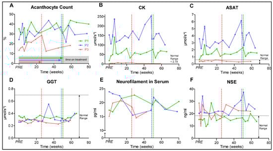 Elevated creatine kinase (CK) persisted in P1 and P2 throughout the study, but increased slightly in P3 (Figure 3B). As CK markedly fluctuated due to athletic activity and tonic-clonic seizure activity, it was not a robust clinical marker of clinical severity in ChAc. Alanine aminotransferase (ALAT) and aspartate aminotransferase (ASAT) levels correlated with CK, while gamma-glutamyltransferase (GGT) and bilirubin remained rather stable within the physiological range, suggesting a likely muscular origin of the increased ASAT and ALAT activities (Figure 3C,D).