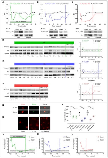 Graphs represent red cell features in ChAc patients. (A–C) Total Lyn was immunoprecipitated from blood samples and detected with an antibody against active Lyn (phospho-Lyn 396) or total Lyn (Wb: Western blot). Initially overactive Lyn was suppressed by dasatinib treatment in all three patients. Lyn activity increased after dasatinib withdrawal. (D–F) Western blot (Wb) analysis of Ulk1 and p62 in red blood cells (RBCs) and densitometric analyses of the immunoblot bands. (G) Confocal microscopy of microfilament actin-fluorescence and transmission light microscopy of RBCs from patient 2 (P2) and the healthy control. Anti-β-Actin-FITC-conjugated antibody-stained total actin and Phalloidin-stained filamentous actin (F-actin). (H) Phalloidin was used for F-actin staining. Scale bar: 10 μm. (I) F-actin staining intensity in P1–P3. Shown are the mean values of intensity ± SEM from n = 3 independent experiments. One-way ANOVA/Bonferroni’s multiple comparison test (p < 0.05). (J–L) Osmotic fragility of RBCs is shown as percentage of RBC lysis at a single osmotic point at 158 mOsm in P1–P3. Patients 1–3 (P1–3), PRE: represents baseline value before initiation of dasatinib treatment, dotted vertical lines represent individual end of treatment.