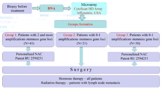 16]. In this work, a prospective study, a new strategy for the prescription of NAC was tested; NAC was prescribed only to patients who had two or more stemness gene amplifications in their tumors. If there were no stemness gene amplifications in the tumor before treatment or if there was only one amplification, then the treatment of such patients began with surgery. The prospective study design is shown in