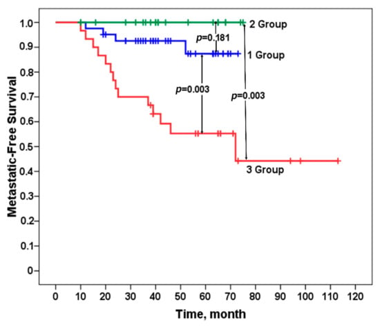 http://vassarstats.net/, accessed on 10 November 2020, Free). Metastatic-free survival was calculated with the Kaplan–Meier method, and differences among patient groups were evaluated with a log-rank test. Statistical analyses were performed with SPSS Statistic 17.0.