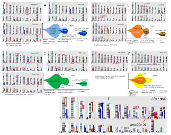 Figure 3, which shows the CNA genetic landscape of the primary tumor before treatment and after NAC, hematogenic metastasis, and the model of clonal evolution of the K1, B2, Ch2, S2 patients (A–D) and the CNA genetic landscape of the residual tumor after NAC of 4 patients of Group 1 with metastasis. The K1 patient of Group 3 had no stemness gene amplification before treatment, and NAC, despite partial regression of 75%, induced the formation of 7q and 8q amplifications; the same amplifications were found in the liver metastasis (