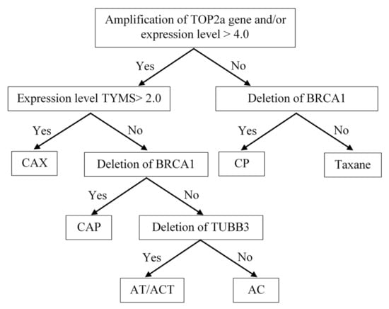 Indications for the use of anthracyclines were the presence of the amplification of the TOP2a gene locus in the tumor tissue, as well as its high expression level of more than 4.0. The question of the feasibility of capecitabine prescription arose when anthracycline drugs were indicated. The main criterion confirming the need for capecitabine was a high expression level of TYMS ≥ 2.0. The presence of a BRCA1 gene deletion in the tumor tissue determined the indication for the prescription of regimens with the inclusion of platinum-based drugs and contraindications for prescribing taxanes. In determinations of the indications for prescribing taxanes, a low level of TUBB3 expression and a deletion in the TUBB3 gene locus (16q24.3) were used as predicting factors.