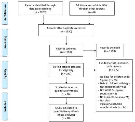Specifically, in Europe, there are few studies on RSV infection. Some studies have investigated the seasonality and geography of RSV in European countries []. However, to date, there is no systematic review that evaluates the prevalence and risk factors of RSV in healthy children in the WHO European Region. Therefore, and in order to obtain a better understanding of the severity of RSV infection, the objective of this systematic review and meta-analysis is to analyse the prevalence and risk factors of RSV infection in children under 5 years of age.