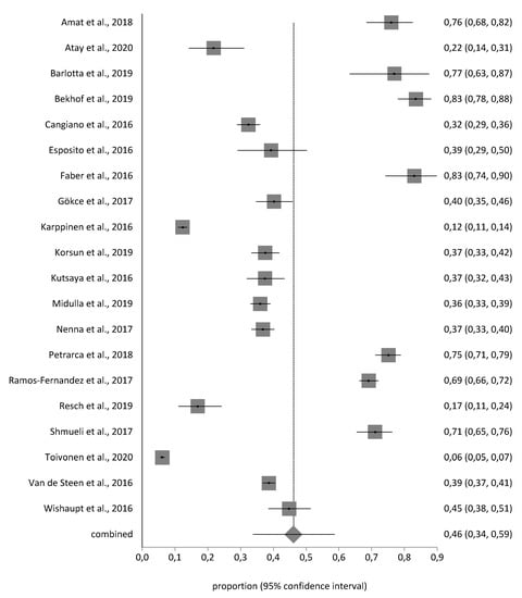 The sample of the meta-analysis was n = 16,115 children. The meta-analytical estimation of RSV was 46% (95% CI 34–59%). The I2 value was 99.4% indicating a high heterogeneity. Egger test did not show publication bias and no study was removed after the sensitivity analysis. The forest plot is shown in Figure 2.