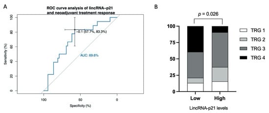 Receiver operating characteristic (ROC) curves were generated to investigate the potential of lincRNA-p21 as a marker for neoadjuvant treatment response. The area under the curve (AUC) value showed that lincRNA-p21 expression had capacity to distinguish patients with complete response (TRG4) from others (AUC: 0.696; 95% confidence interval (CI) = 0.558–0.833; p = 0.014). In the optimum truncation point (−0.1), the sensitivity and specificity were 83.3% and 57.7%, respectively (Figure 2A). Using the best threshold identified by the ROC curve analysis, we divided the patients into two groups, observing that there were differences in TRG proportions allocation between low or high lincRNA-p21 levels (p = 0.026, Figure 2B). Among patients with low levels of lincRNA-p21, 39.5% had a TRG 4 vs. only 9.4% in the group with a high lincRNA-p21 expression value.
