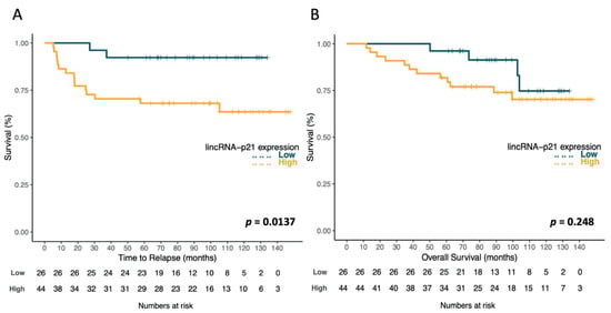 Using the optimal cutoff values identified by X-Tile, the patients were classified in two groups as having high or low lincRNA-p21 levels. Among the 70 RC patients, 26 were classified as low, and 44 as high. Patients with high lincRNA-p21 levels had significantly shorter TTR (p = 0.014). TTR for patients with high levels was 104.4 months (95% CI 86.4–122.5), while it was 126.2 months (95% CI 115.7–136.6) for those with low levels (Figure 3A). No significant differences were observed for OS (p = 0.284), but patients with high lincRNA-p21 levels had shorter OS (116.9 vs. 129.5 months; Figure 3B).