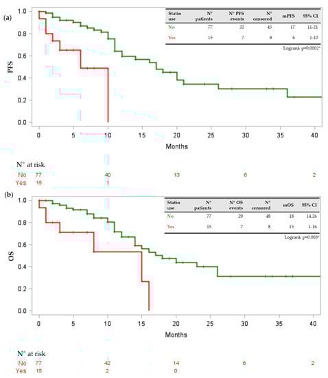 (a) Kaplan–Meier curve describing PFS in relation to statins. (b) Kaplan–Meier curve describing OS in relation to statins. Legend: PFS progression-free survival; OS overall survival; + censored; * statistically significant.