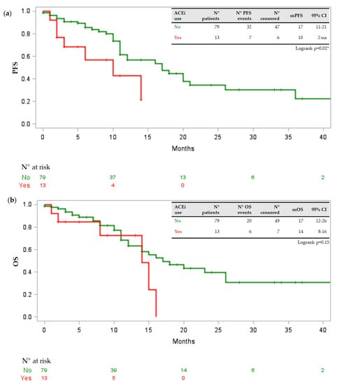 (a) Kaplan–Meier curve describing PFS in relation to ACE inhibitors. (b) Kaplan–Meier curve describing OS in relation to ACE inhibitors. Legend: PFS progression-free survival; OS overall survival; ACEi ACE inhibitors; + censored; * statistically significant.