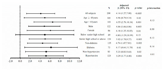 The correlation between self-care behavior and health literacy in different subgroups of study subjects. Adjusted β values were adjusted for age, sex, smoking status, duration of chronic kidney disease care, number of health education sessions, body mass index, uric acid, log-formed triglyceride, and the log-formed urine protein-creatinine ratio.