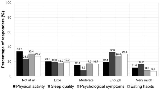 Furthermore, the school closure was found to negatively impact the children’s physical activity, psychological status, sleep quality, and eating habits. More specifically, almost 50% of the parents reported that their children had bad or moderate physical activity (53.8%), poor (bad or moderate) sleep quality (42.6%), psychological symptoms (48.4%), and unhealthy eating habits (46.2%). According to the parents, the mean sleep time of their children was 10.5 ± 1.2 h, and the time of awakening was 8.8 ± 1 h during the school closure. The parent-reported impacts of school closures on the physical activity, sleep quality, psychological symptoms, and eating habits of the children are presented in Figure 4.