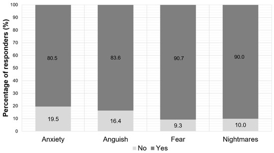 Almost half of the respondents reported children’s impaired psychological status. Moreover, more than 80% of the parents claimed that their children had anxiety, anguish, fear, and poor sleep quality with nightmare disorders during school closure, although the average sleep duration reported by parents was not negatively impacted. The most prevalently reported adverse psychological effect of school closure was fear, closely followed by nightmares. Isolation carries a multitude of psychological burdens and various neuropsychiatric manifestations (anxiety, distress, and fear) [13]. Isolation under stressful conditions also impacts the quality of sleep. Sleep plays an essential role in children’s development and is essential for their physical and mental health [17]. Other studies estimated that 25% of all children experienced at least one sleep-related disorder during the quarantine [35]. It has been reported that poor sleep quality leads to daytime drowsiness, headaches, behavioral problems and affects health and life quality and, subsequently, poor academic performance [17,36].