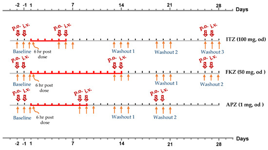 Study design. The red marked date indicates the ITZ/FKZ/APZ daily administration. The striped arrow indicates the MDZ AUC plasma sampling. The orange arrow indicates spot urine sampling, which was collected the morning before drug administration except for the 6 h post-dose urine collection on Day 1. (p.o.—oral administration; i.v.—intravenous administration; od—once-daily).