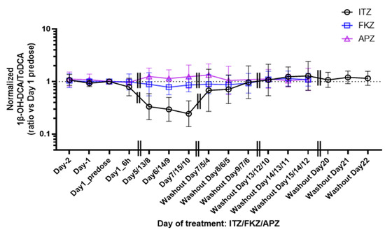 The time-course of the measured 1β-OH-DCA/ToDCA ratios were normalized using pre-dose values on Day 1. A decreased 1β-OH-DCA/ToDCA UMR from baseline was observed following ITZ treatment (100 mg) (Figure 2). The effect was lower in the FKZ (50 mg) group. No inhibition was observed in the APZ (1 mg) group. The ratios returned to baseline after the washout period. Following a single dose of ITZ, the ratio of 1β-OH-DCA/ToDCA decreased 21% from baseline in the 6 h post-dose urine. Following repeated once-daily doses of ITZ for four days, a significant 67% reduction in 1β-OH-DCA/ToDCA was observed and continued to decline to 75% after six, once-daily, 100 mg ITZ oral doses. The 1β-OH-DCA/ToDCA ratio was fully restored to baseline nine days after the completion of ITZ treatment.